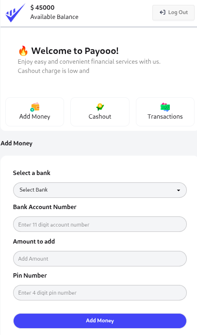 A functional mobile banking prototype that allows users to add money, cash out, and view transaction history. Users can also delete transactions and see the transaction timestamp. Demo credentials: Mobile number: 123456789, PIN: 1234.
