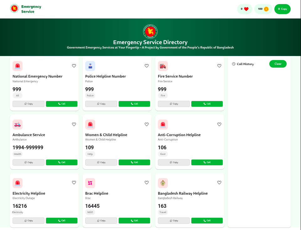 This is an interactive web application designed to simulate a realistic emergency service calling system for urgent situations. Users start with 100 virtual coins, and each emergency call deducts 20 coins from their balance. The app displays the caller’s name and phone number for each call, providing a clear and organized call log. If the user’s coin balance falls below 20, further calls are automatically disabled to ensure proper resource management. The application also includes a heart button feature that allows users to gain extra lives, enhancing interactivity and user engagement significantly. All call activities are tracked in the Caller History section, where users can see a detailed log of every call made. A Clear History button allows users to reset the log at any time, while a Copy button enables quick and convenient copying of phone numbers for ease of use. This project highlights skills in dynamic UI design, event handling, state management, and real-time updates, making it an excellent demonstration of building interactive, responsive, and user-friendly web applications.