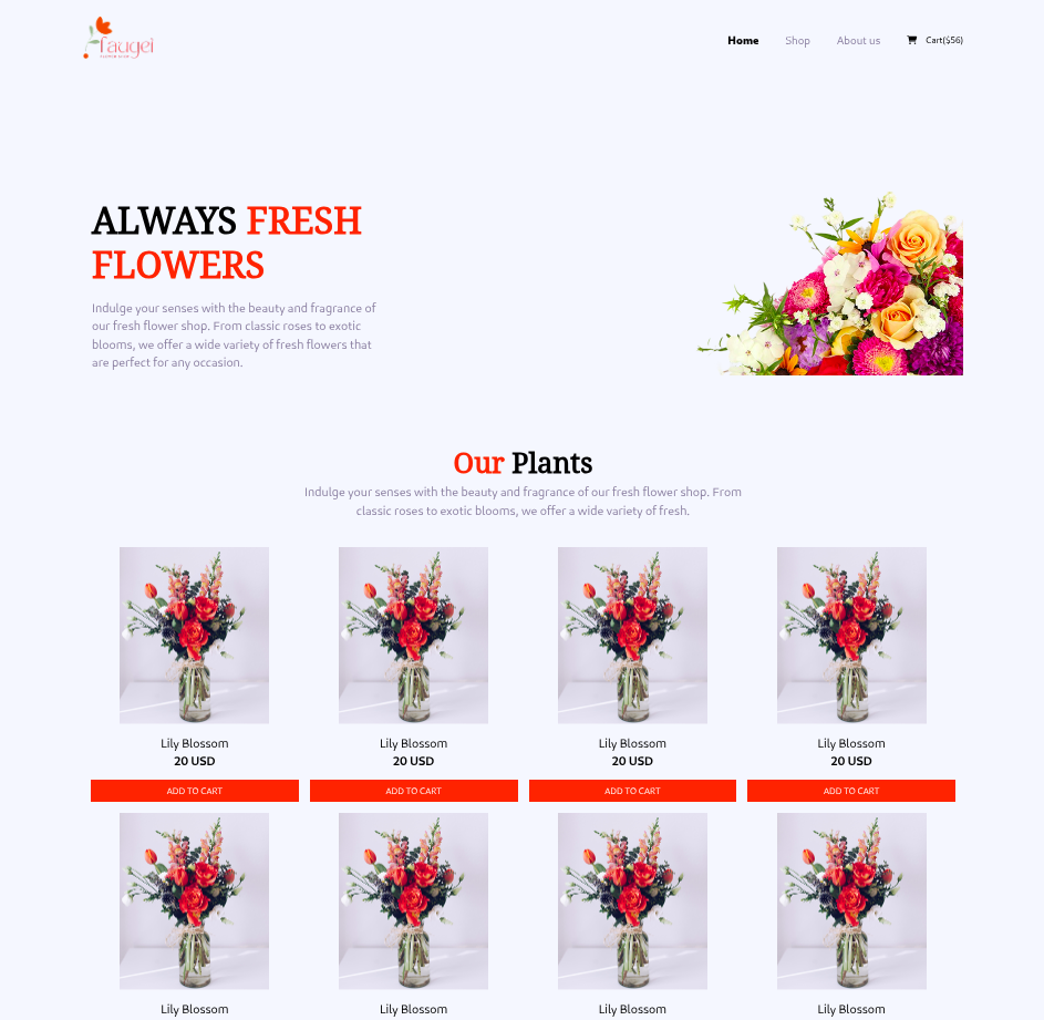 This is a fully responsive prototype website designed to showcase an online flower shop. It features multiple sections including Home, Shop, Cart, and About Us, providing a realistic and visually appealing layout for a commercial website. Users can browse flowers, filter by category, and add their favorite ones to the cart, and even explore options to join a branch for enhanced engagement. Although the website is a prototype and some functionalities are not yet fully implemented, it clearly demonstrates the structure, design, and responsive layout of a real e-commerce platform. This project marks my first responsive website, highlighting skills in HTML, CSS, responsive design, interactive UI, and modern web structuring. The project emphasizes a clean and engaging user interface, organized navigation, intuitive interactive elements, and thoughtful visual hierarchy, making it a strong foundation for future full-fledged e-commerce website development.